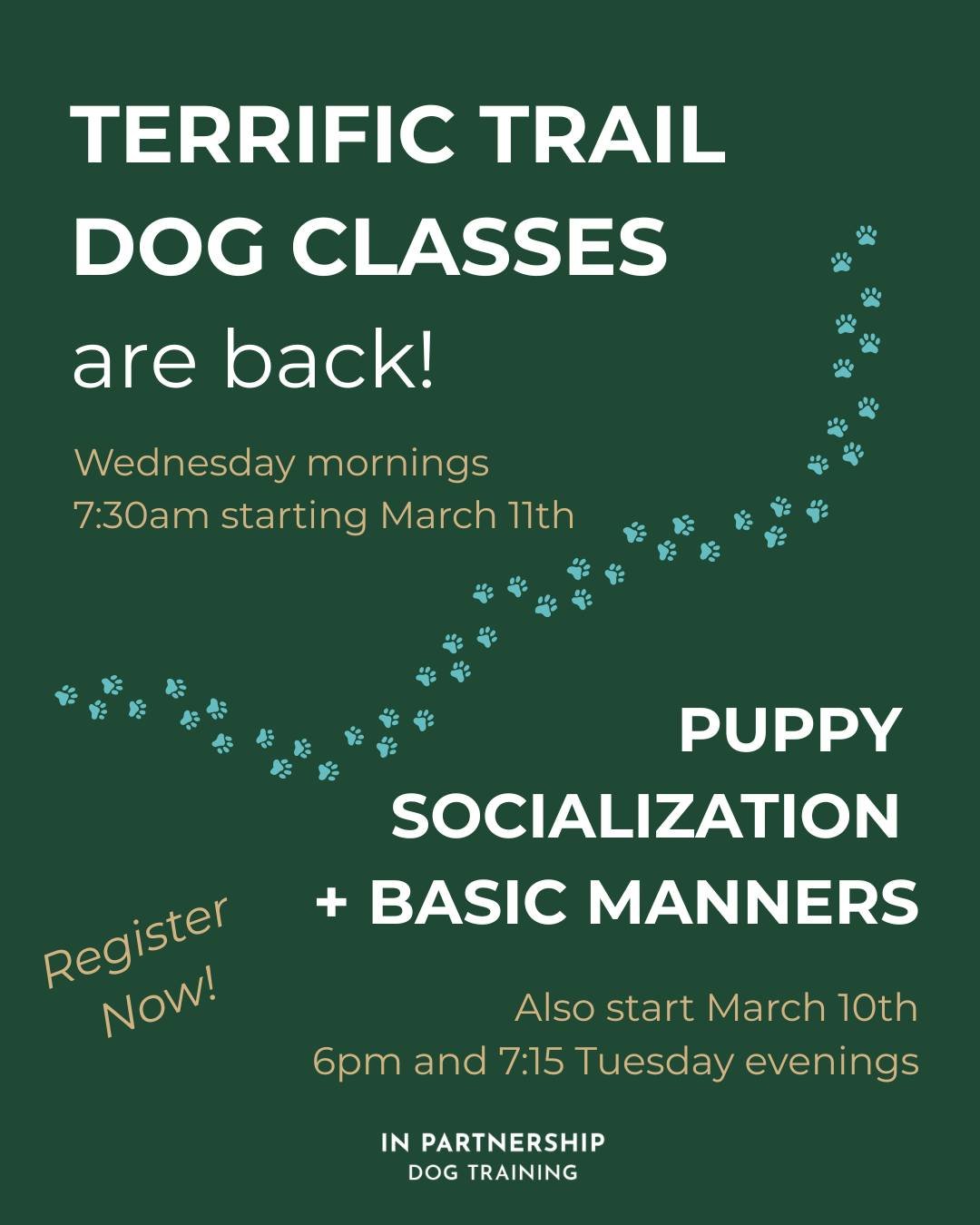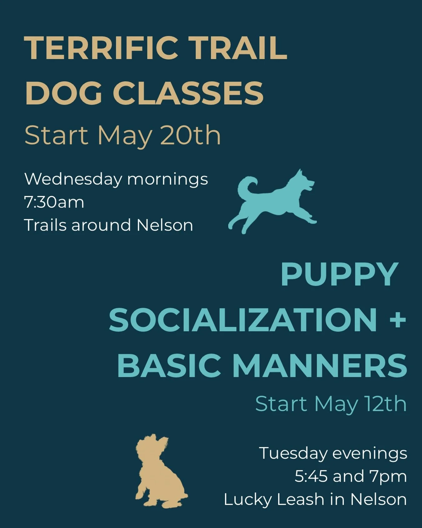 We offer group basic manners and puppy socialization classes in Nelson BC to get your dog off to a super start with obedience, confidence and working around other dogs. In addition our Terrific Trail Dog class works towards off leash trail skills and manners around other trail users. Classes are a great option if you are on a budget and a must for all puppies! Not for dogs exhibiting reactive or aggressive behaviours.